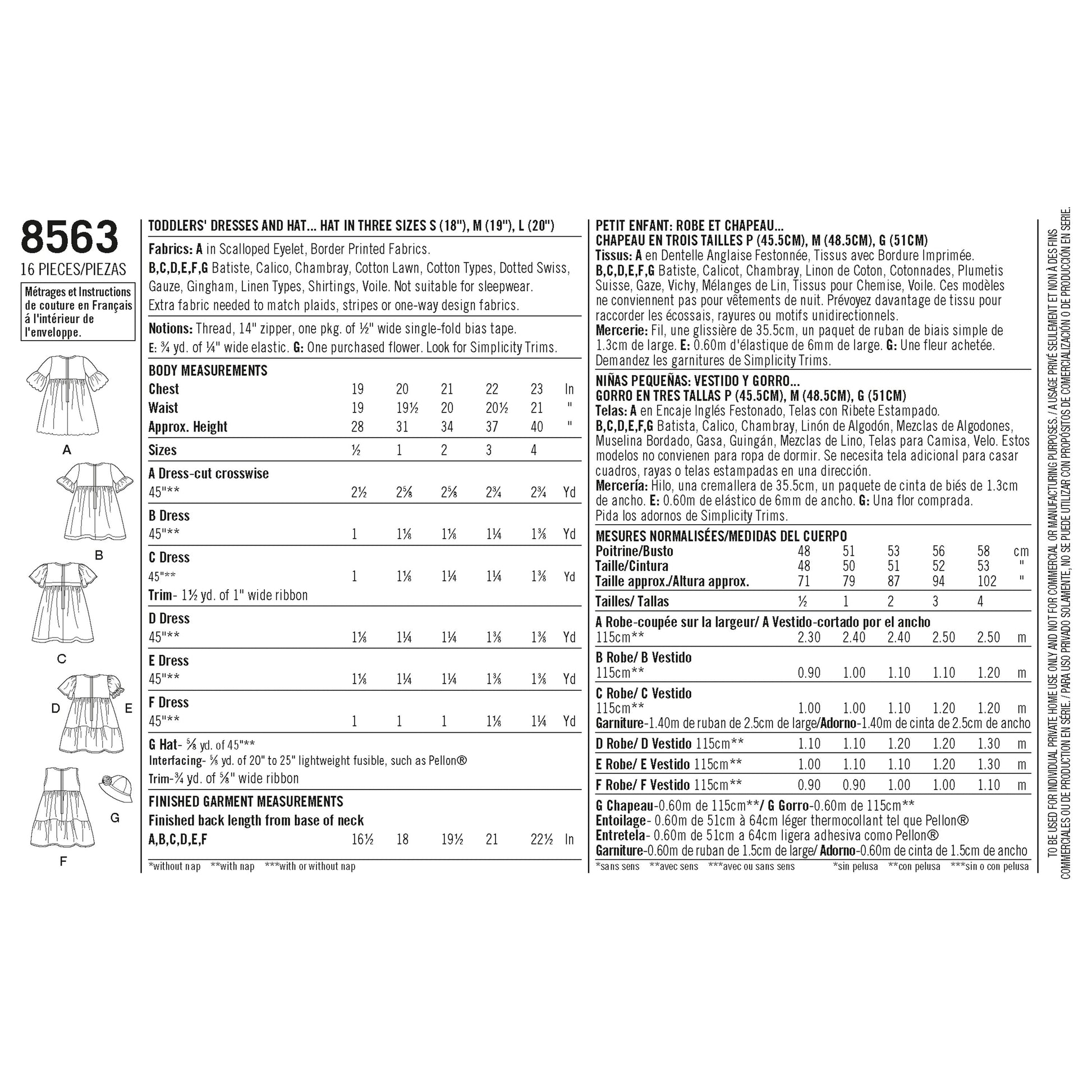 Six made easy dresses in toddler sizes 1/2-4 features sleeve and bodice variations with hat available in three sizes SM (18") M (19") and L (20"). Simplicity pattern and sewing instructions.