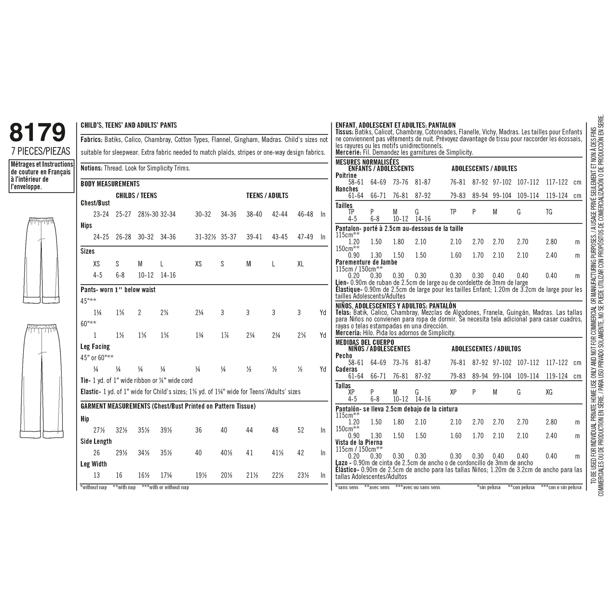 Simplicity Pattern 8179 Child, Teen and Adult Lounge Pant