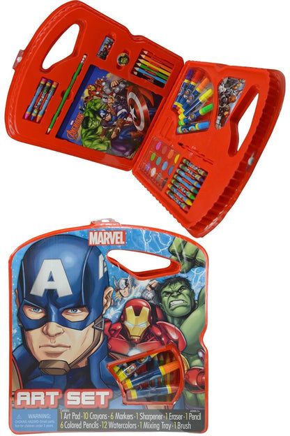 Contains 1 Art Pad, 10 Crayons, 6 Markers, 1 Sharpener, 1 Eraser, 1 Pencil, 6 Colored Pencils, 12 Watercolors, 1 Mixing Tray, 1 Brush