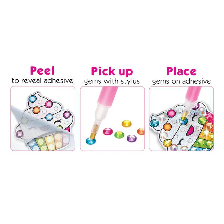 No glue needed! Just peel the clear cover off the adhesive then use the stylus to pick and place the colorful gems.