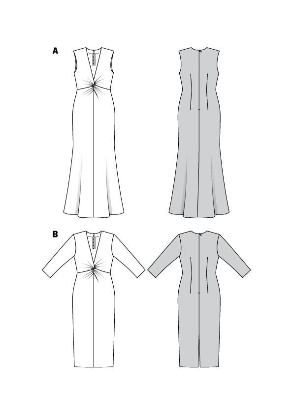 - Extravagant dresses with a clever twist in front just below a deep V-neckline. Dress view A is sleeveless and the long, flared skirt makes it suitable for an evening event.