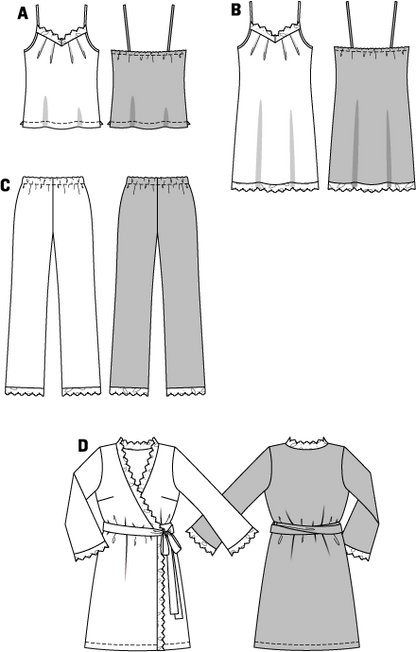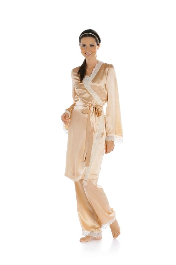 - Precious lingerie for the night, nicely ornamented with lace trimming: strap top, pajama pants, nightdress and dressing gown.