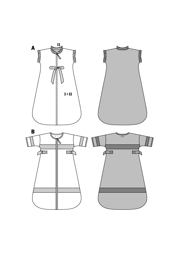 - View A is sleeveless, with tie bands and frills. View B has sleeves, bound edges and bands of contrasting fabric to adjust the snugness of the fit.