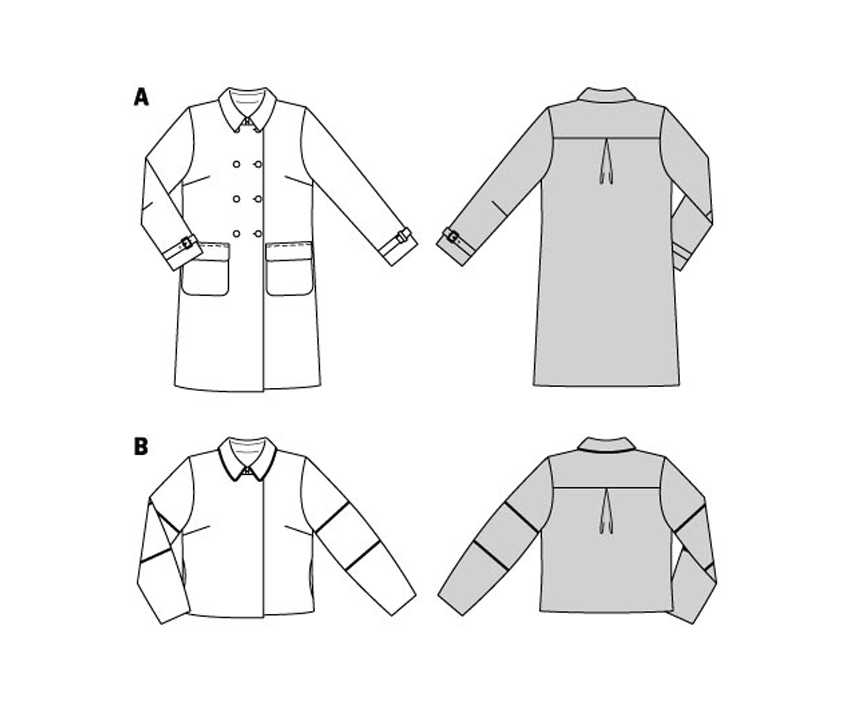 This double-breasted coat with patch pockets reminds us of a trench coat. It is just as much on trend but looks chic without too many details. The short jacket with piping on the sleeves and side pockets looks fresh thanks to the print fabric.