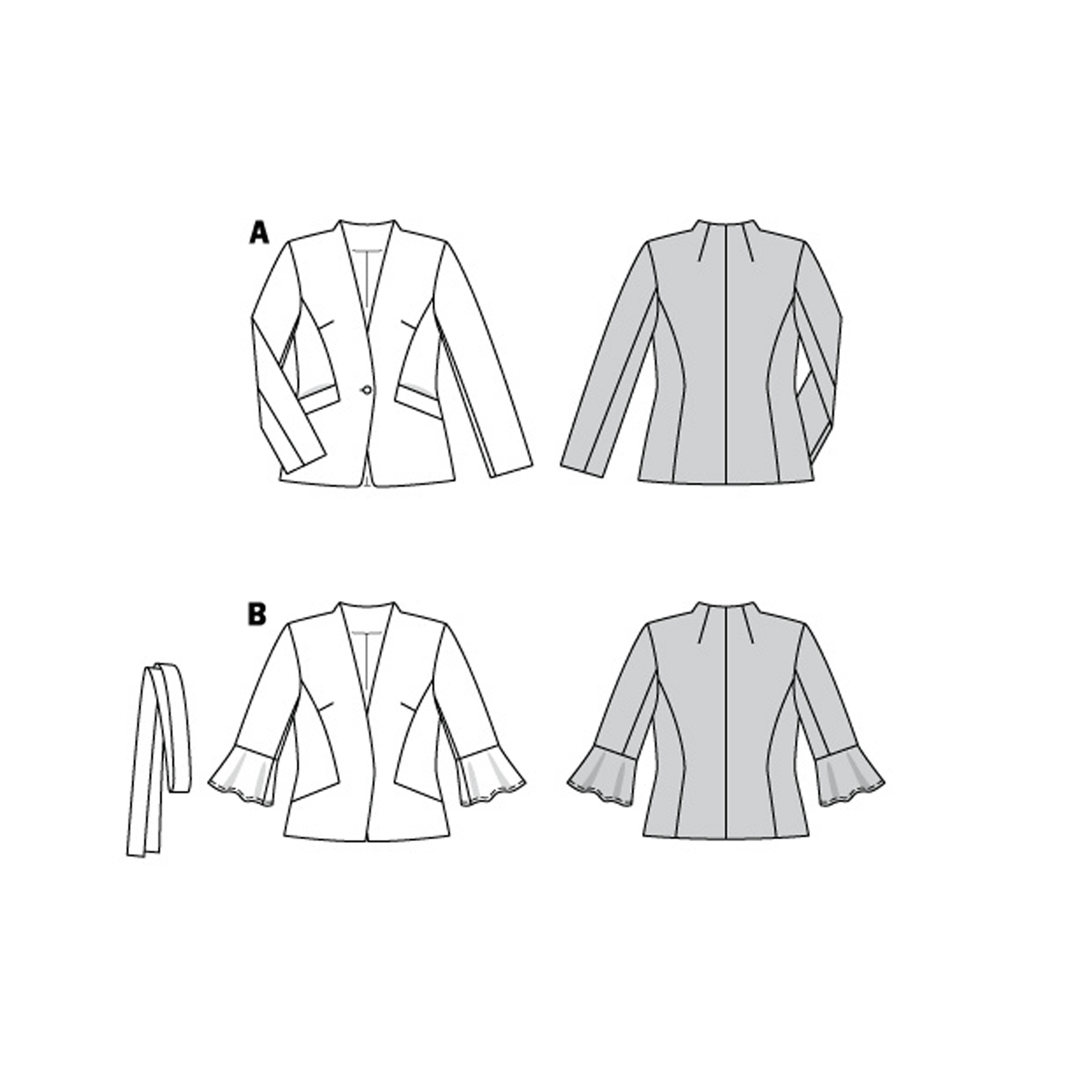 If you find the lines of a classic blazer too harsh, you will love this chic lined jacket with integral collar and a slight V-neckline. The seams create an interesting effect and you can include pockets if you like. This garment will require some sewing experience, however. The shorter, more feminine version with sleeve flounces is also pleasing.