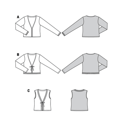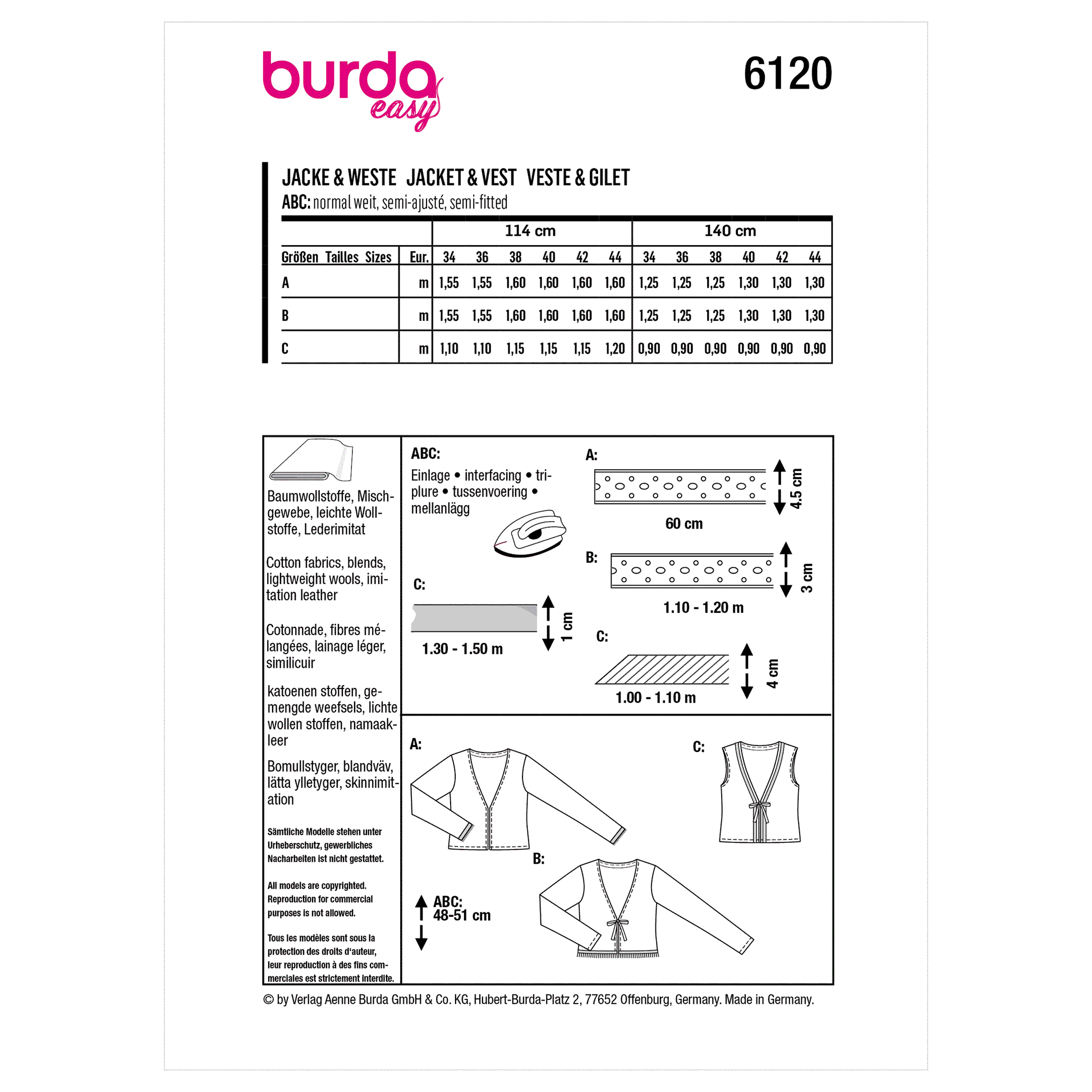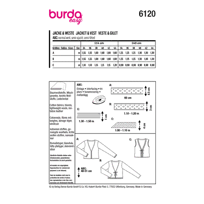 A long V-neckline and narrow sleeves characterize these short jackets. The sleeveless vest is closed with ties. Quilted ribbons in different widths add an individual touch.