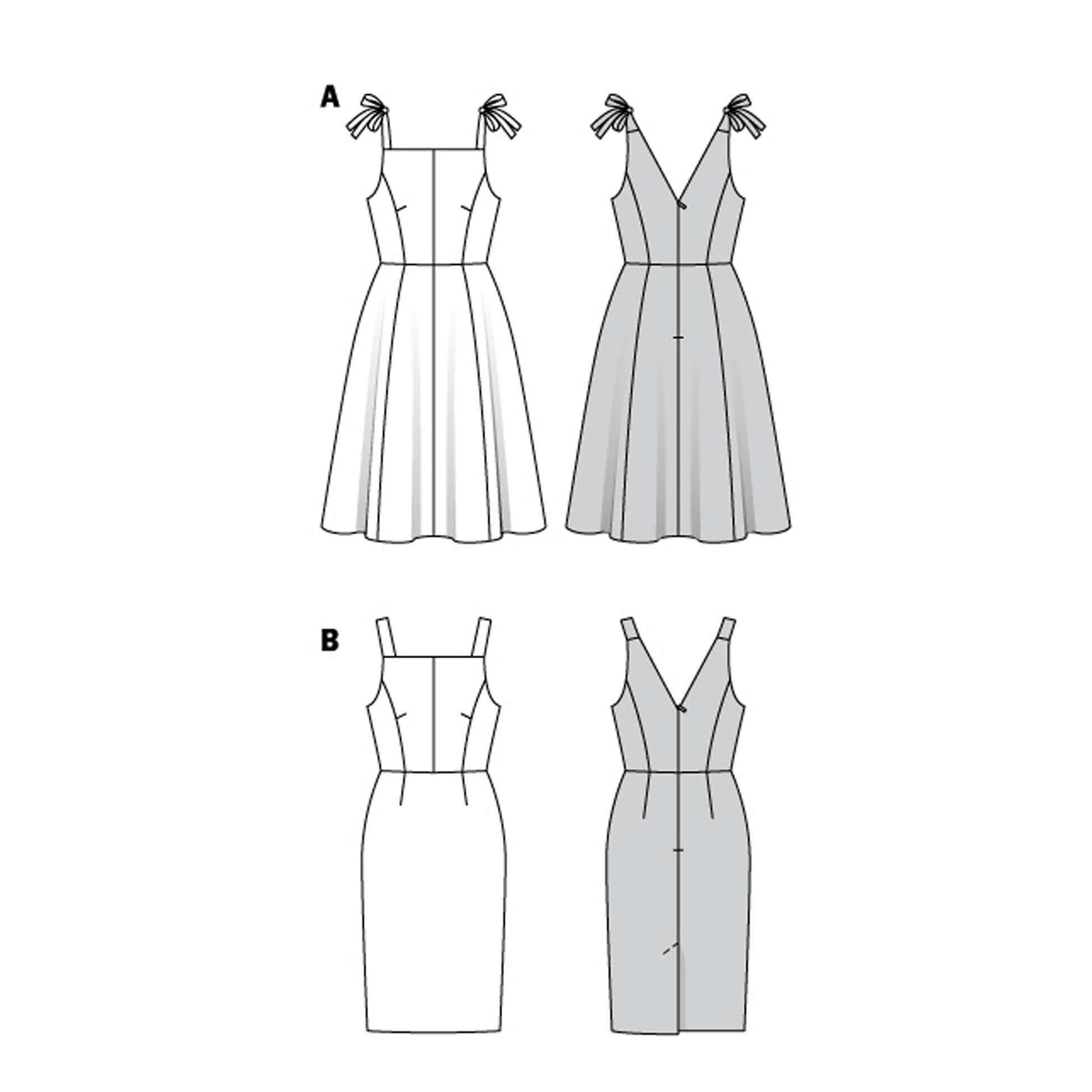 Chic sundresses for the height of summer. View A features a flared panel skirt in trendy midi length. View B has a narrow skirt in a classic lady-like Italian length. Both are eye-catchers.