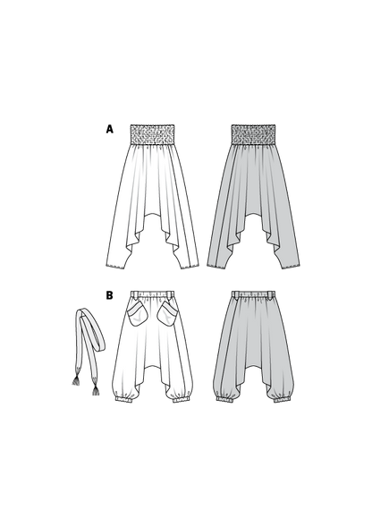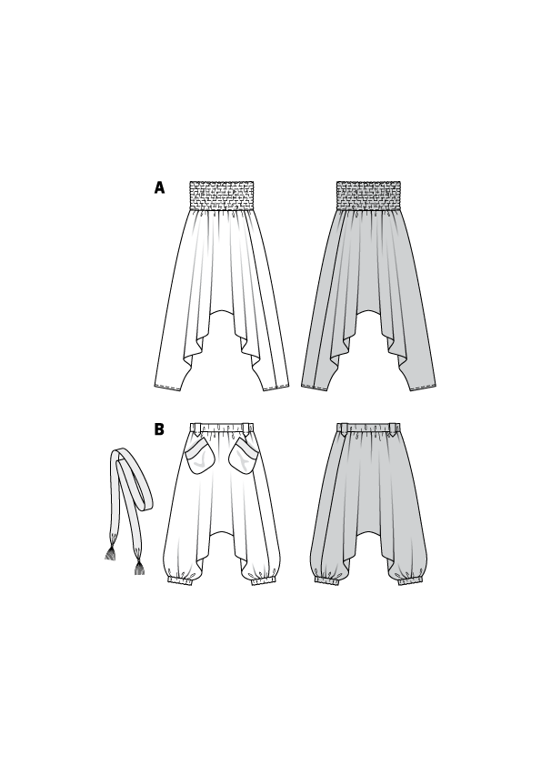 Great leisure pants/trousers in Ethno-Look with lots of leg room will put you in a vacation holiday mood. The legs of view A taper nicely toward the bottom and the waistband has elastic shirring. View B comes in 3/4-length with elastic leg bands, patch pockets and a tie belt made of trim.