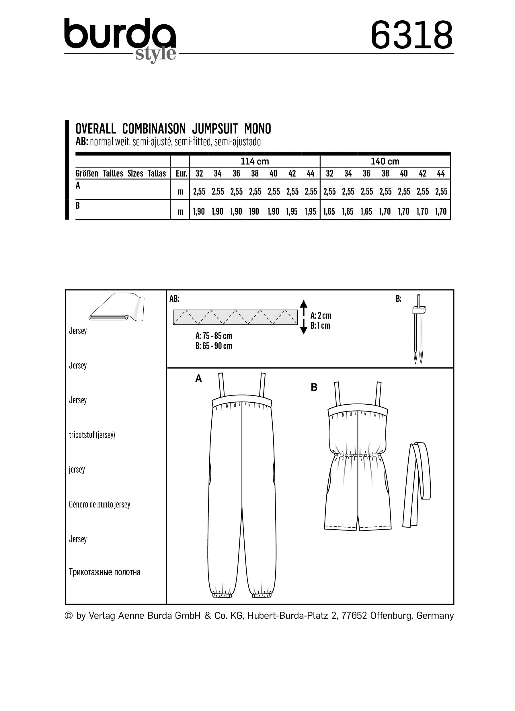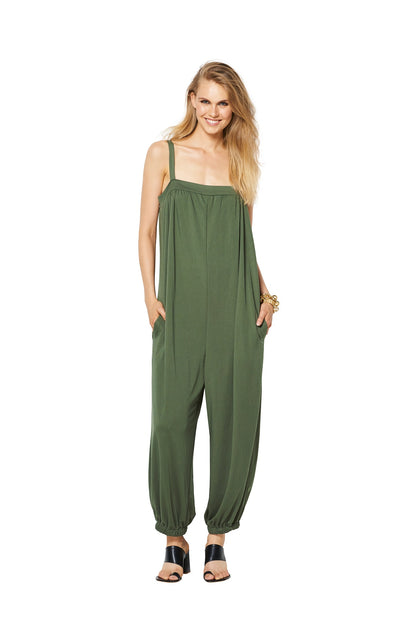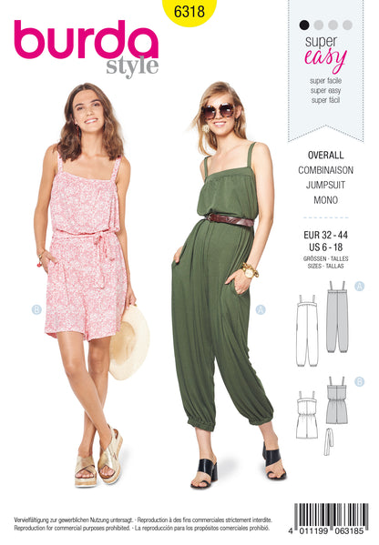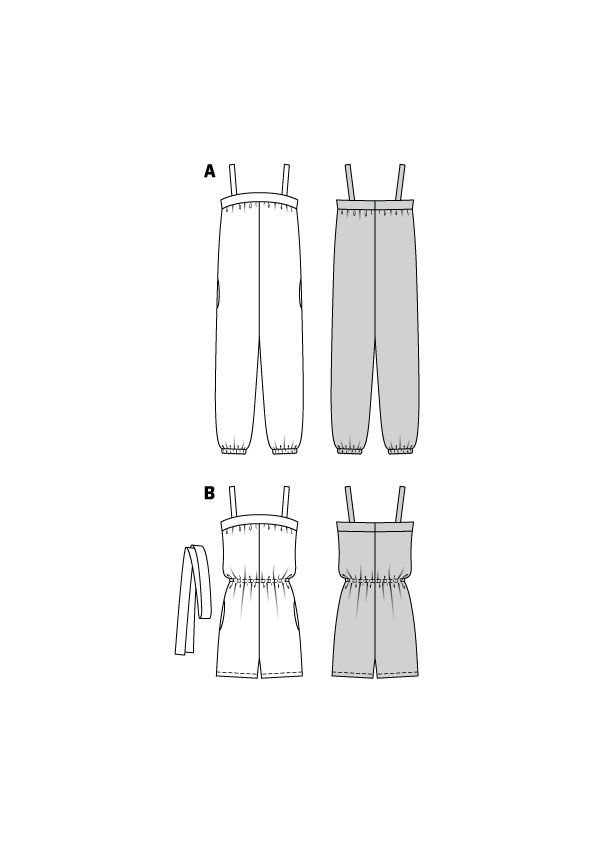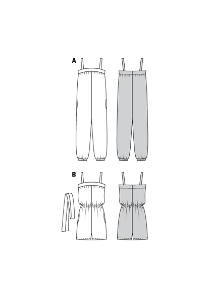 The comfortable onesie jumpsuit of jersey can be made up in two variations: long with elastic at the bottom legs or short with a tie belt and elastic waist. This garment is sure to be a favorite for easy summer wear.