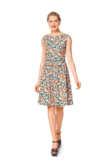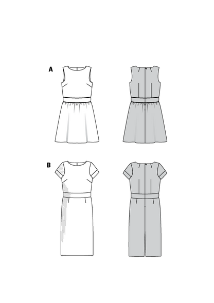 Both dresses score with fashion details. Sleeveless dress view A features a gathered skirt accented with piping. The narrow skirt and short sleeves of dress view B are set off with striped fabric.