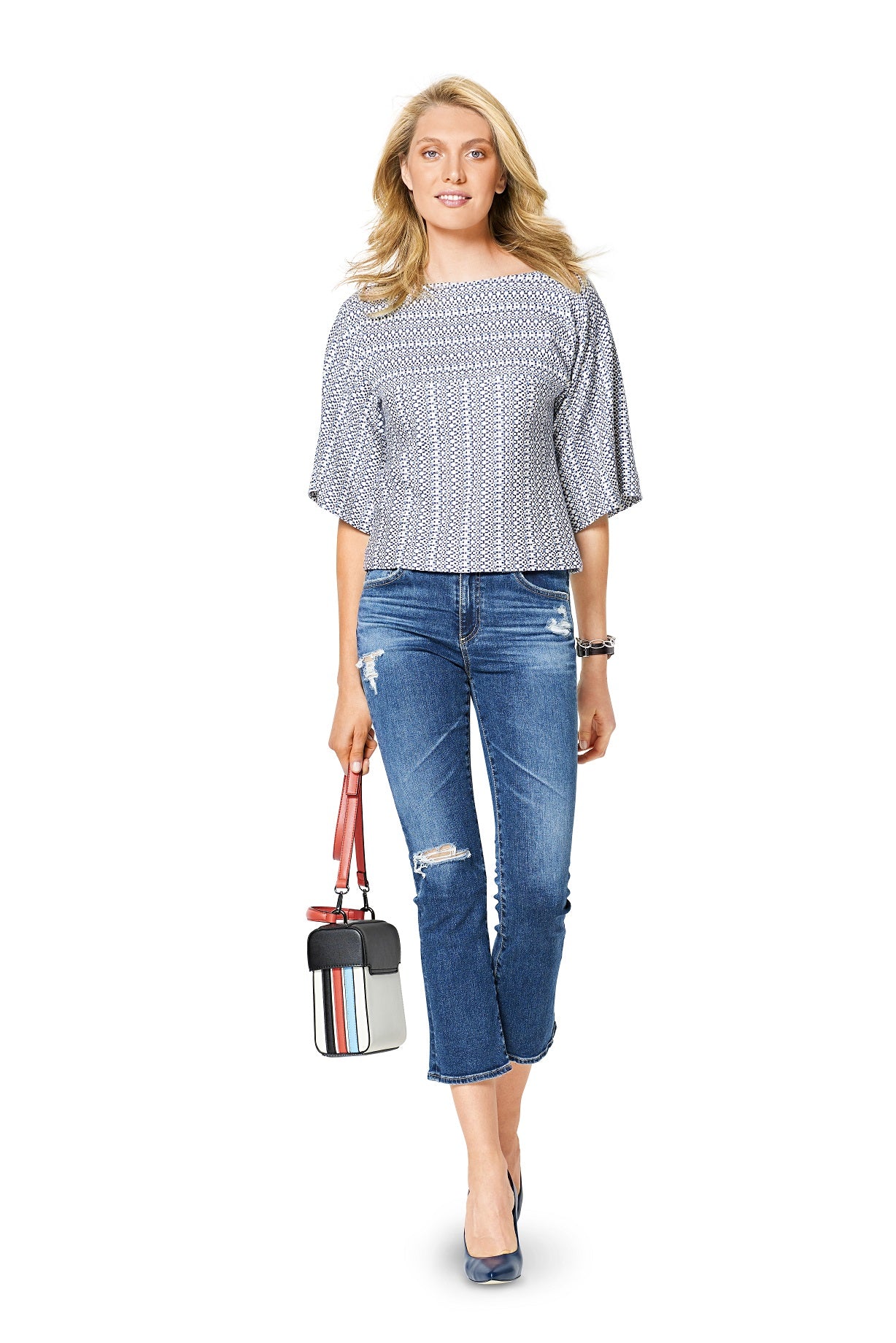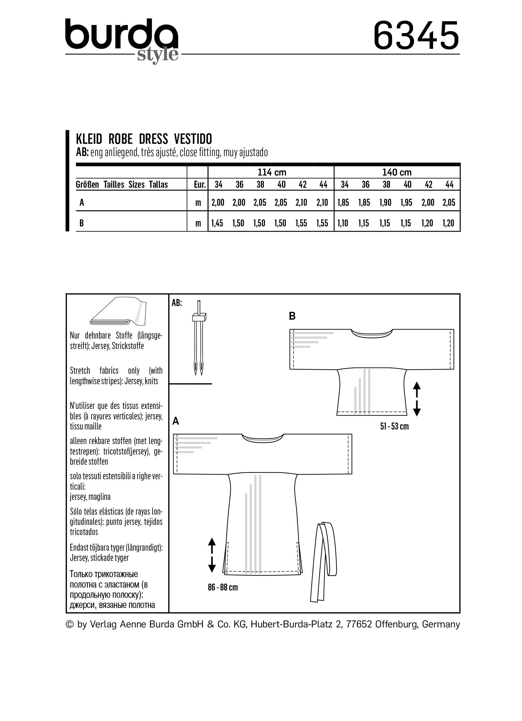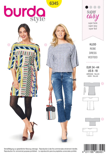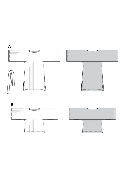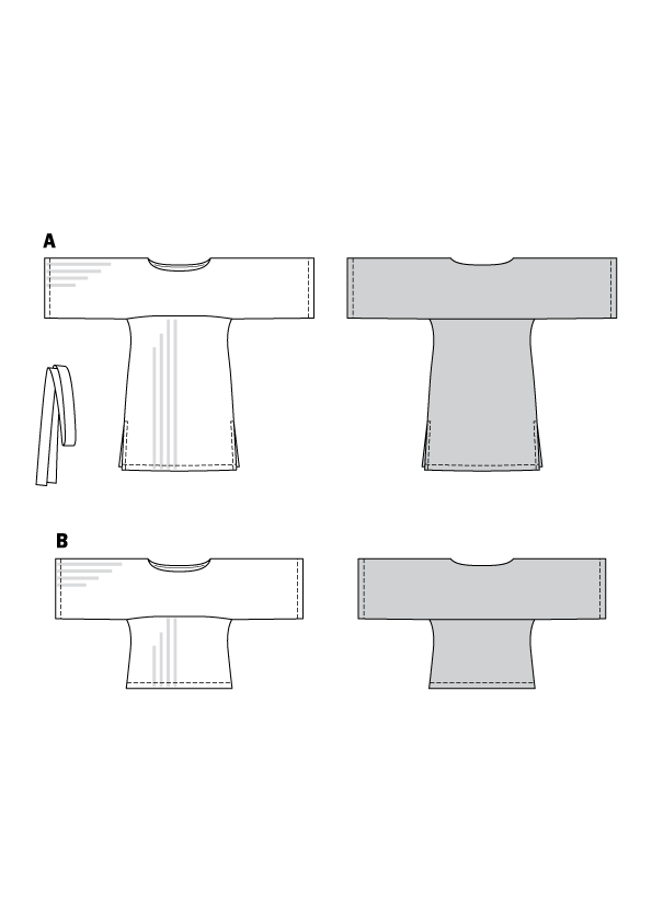 Loose-fitting dress with side slits and a tie band. The sleeves are an integral part of the yoke. View B follows the same lines but is a shorter version. Playing with stripes is fun!