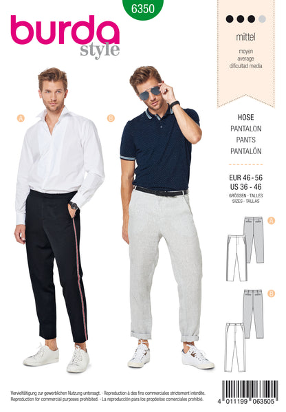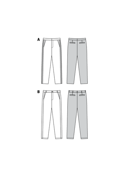 Up-to-date men’s pants/trousers with angled pockets and back pockets – a favorite for both a day off or at the office. The use of contrasting ribbon for view A accents the forward side seams.