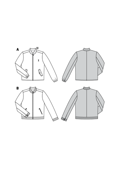 Classic blouson jacket with a zipper fastener. View A features a stand collar of rib knit band and elastic at the wrists. View B is detailed with several rows of topstitching on the stand collar, hem band and cuffs.