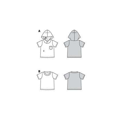 The ever so popular hoodie makes a comeback in summer as a short sleeved top. The hood is lined with jersey in a contrasting color and the small patch pocket lends a bright touch. Choose a striped or other favorite print for the basic top view B. Your kids will want to live in it.
