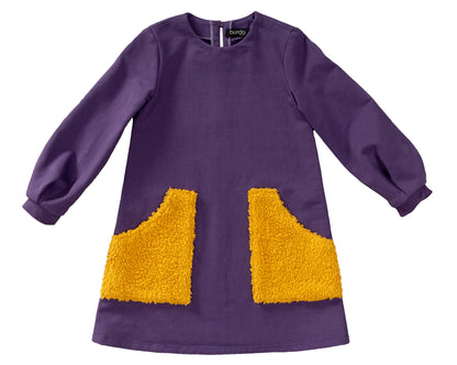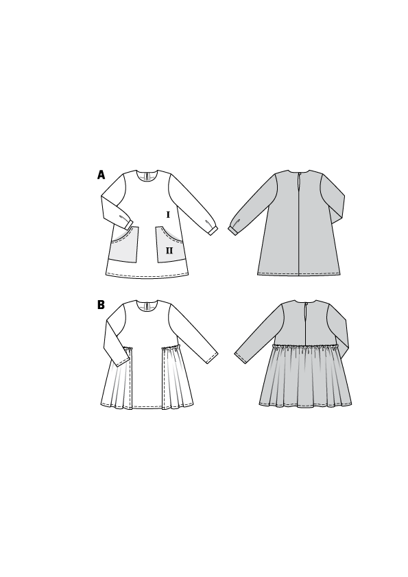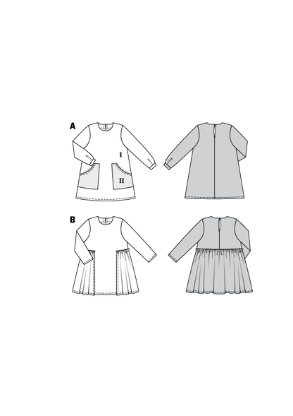 Both dresses feature a back slit and long sleeves. Although these are simple styles and easy to sew, the patch pockets and gathered overskirt keep them interesting.