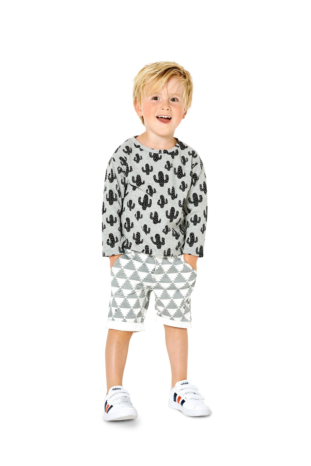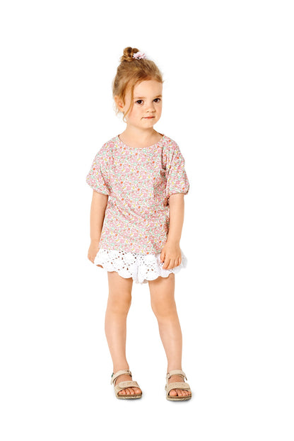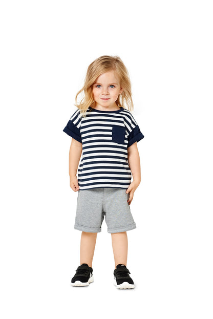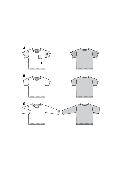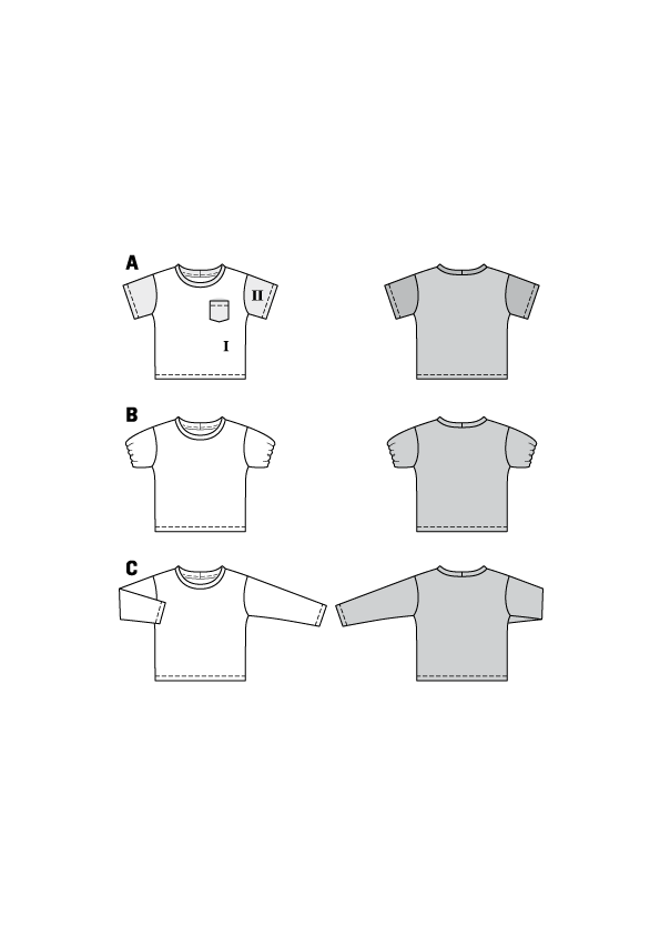 | Kids can never have enough tops. Here are three variations with narrow neckbands and different sleeve styles. Make them up in several colors or play with a mix of colors and patterns. |