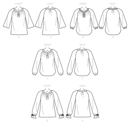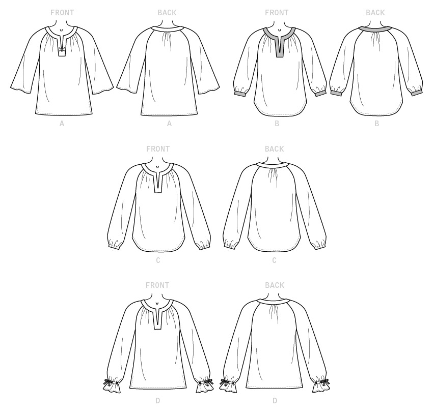 Very loose-fitting pullover top has shaped neckband and raglan sleeves and fabric, sleeve and hem variations. B: Contrast neck and sleeve bands, shaped hem. C: Elasticized sleeve, shaped hem. D: Sleeve ties with carriers.
