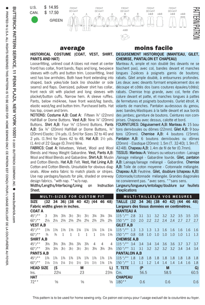 Butterick Pattern B3072 Historical Costume (Coat, Vest, Shirt, Pants and Hat)