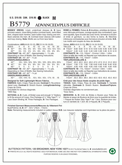 Lined, underlined dress has princess seams, close-fitting bodice (contrast back), semi-fitted skirt, shaped back hemline and back button loop closing/trim. Back extends into train. A: contrast lower sleeves with button/loop closing. Note: motifs are cut from lace fabric.