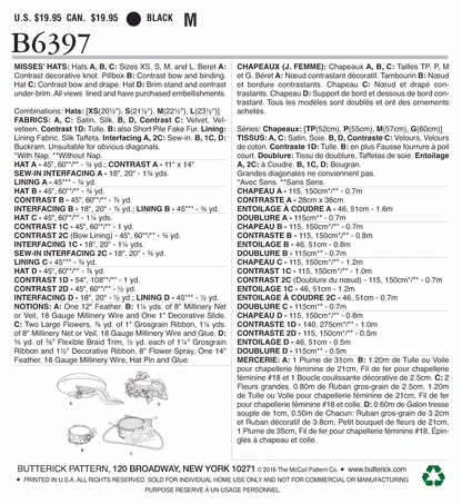 Hats A, B, C come in size XS, S, M and L. Beret A has contrast decorative knot. Pillbox B has contrast bow and binding. Hat C has contrast bow and drape. Hat D has brim stand and contrast under-brim. All views are lined and have purchased embellishments.