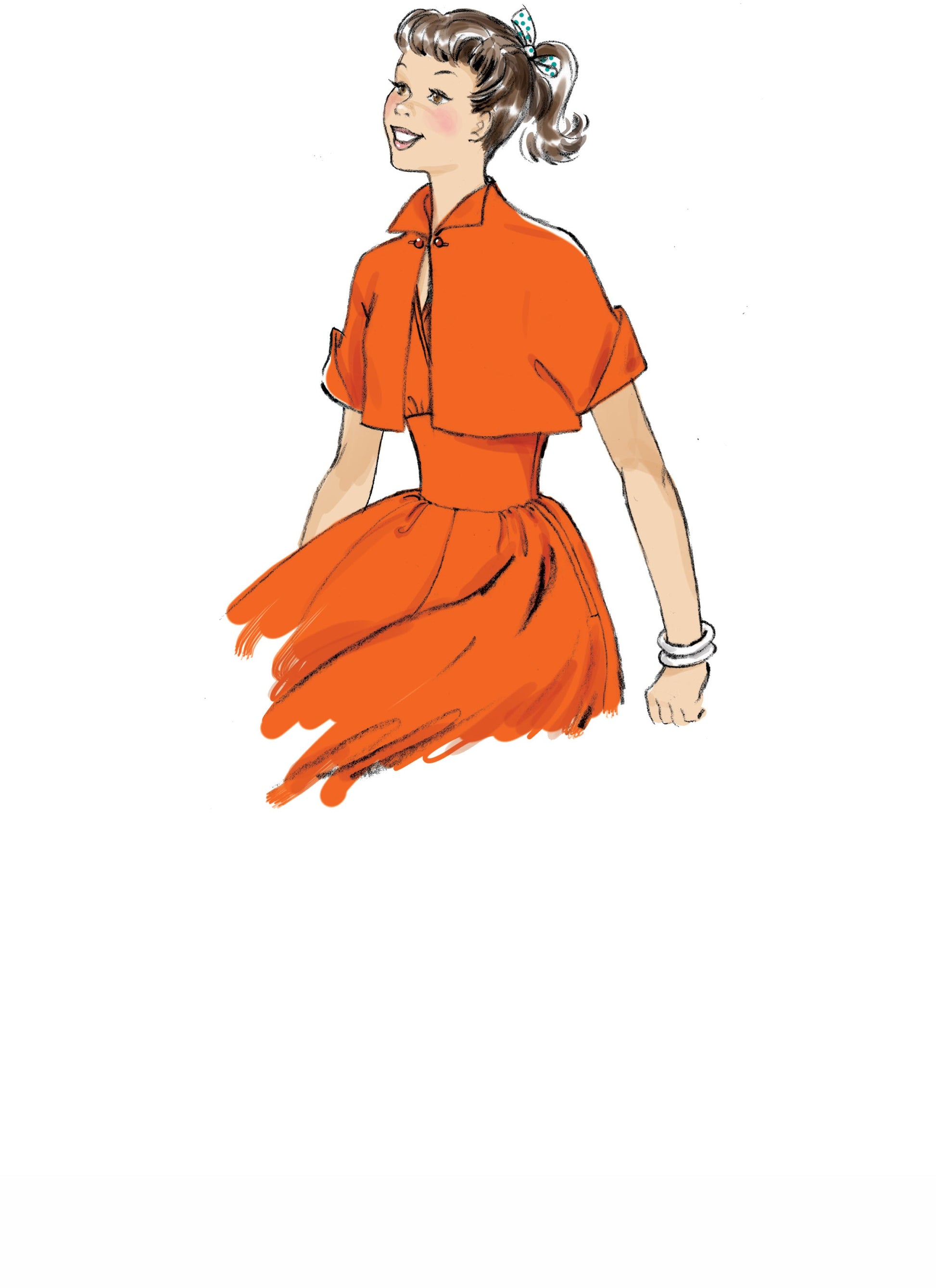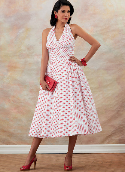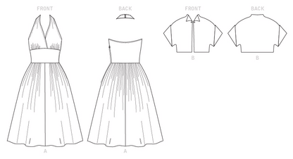 Unlined Dress A with close-fitting halter bodice, hook and eye closure, and horsehair-lined hem, is finished with purchased bias tape. Unlined Jacket B closes with thread-linked buttons, and has shaped cuffs finished with purchased bias tape.