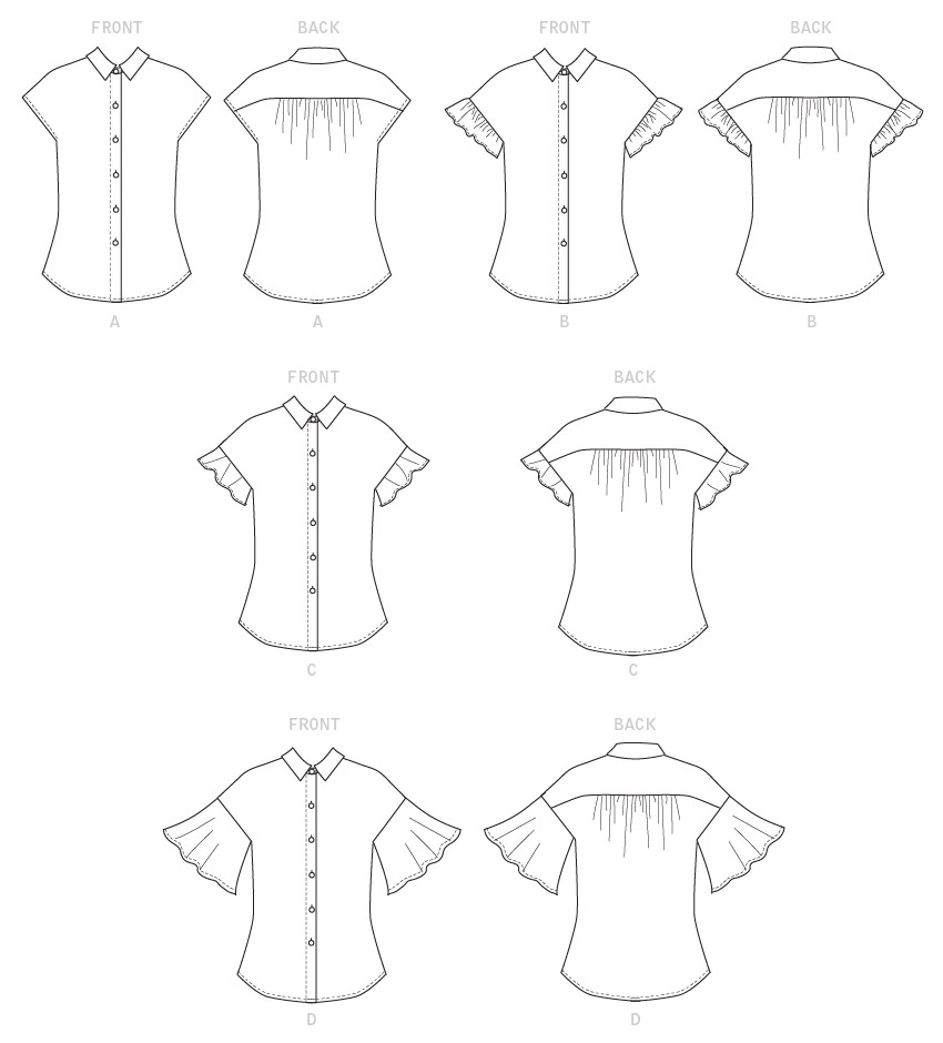 Semi-fitted button front tops have gathers at back, collar, sleeve variations and shaped hem.