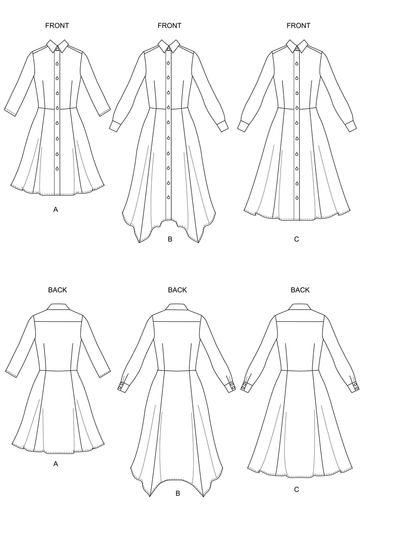Dress has fitted bodice and princess seamed flared skirt, sleeve and length variations. Separate pattern pieces provided for A/B, C, D cup sizes.