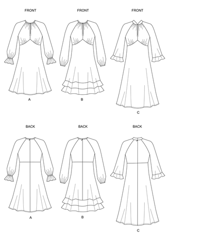 A, B, C: Close fitting dress in two lengths has front gathers, flare hem, invisible zipper, raglan sleeve variation in two lengths and neckline finish variation. A: Elastic sleeve casing forming self ruffle, neck binding. B: Elastic sleeve casing, neck binding, double flounce. C: Collar, sleeve flounce.