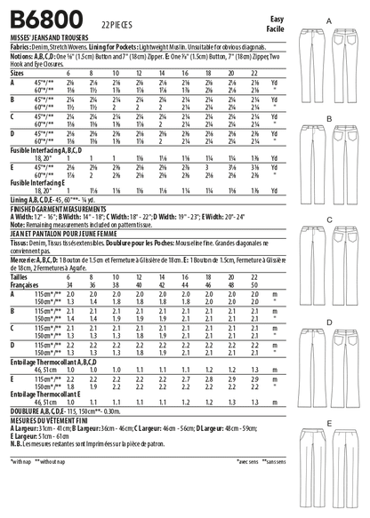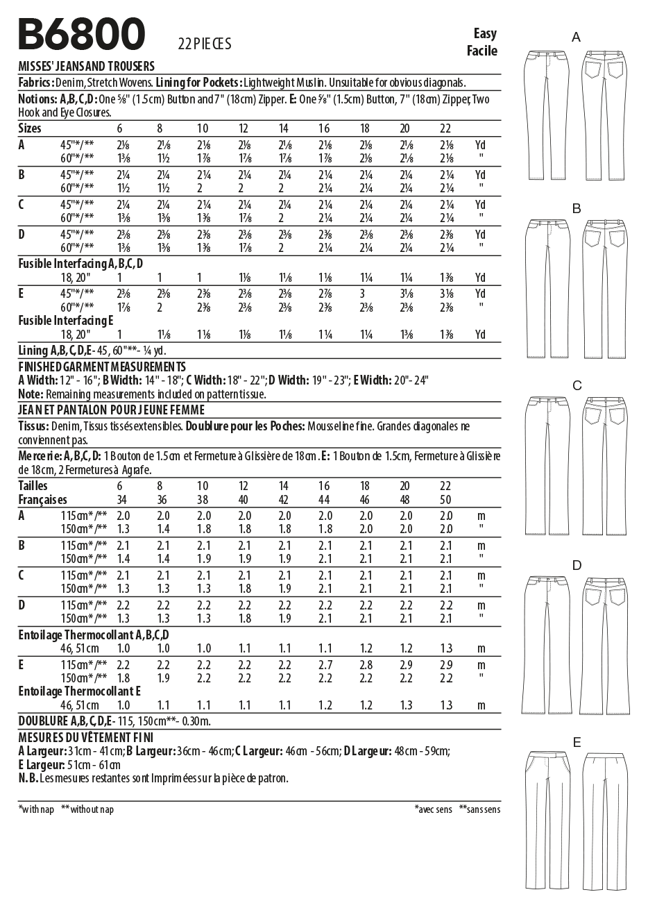 At waist, fitted jeans A, B, C, D & semi-fitted trouser E, have contoured waistband, pockets, belt loops, back yoke & fly zipper. A: slim leg, ankle-length. B: straight leg. C: boot cut. D: flared leg. E: straight leg, tab, hook & eye closure.