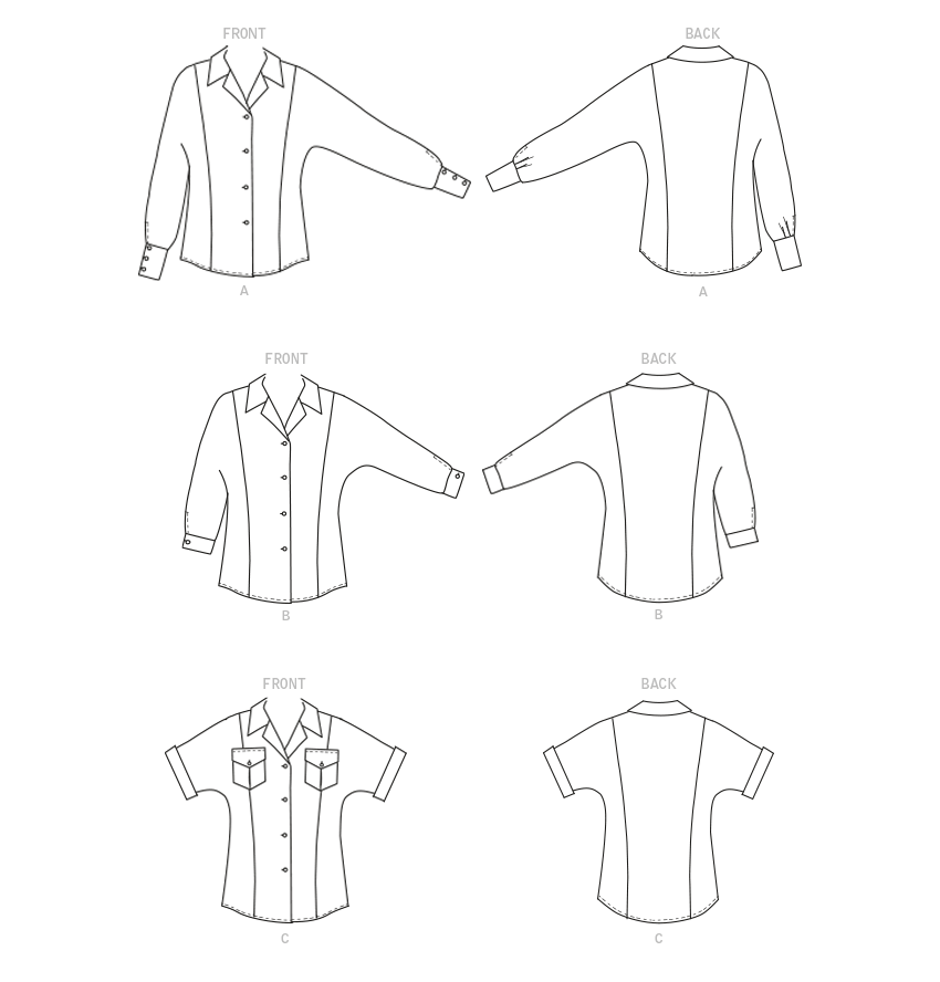 Button front princess seam top has dolman sleeves with long, three-quarter and short sleeve lengths. Optional pocket on front.