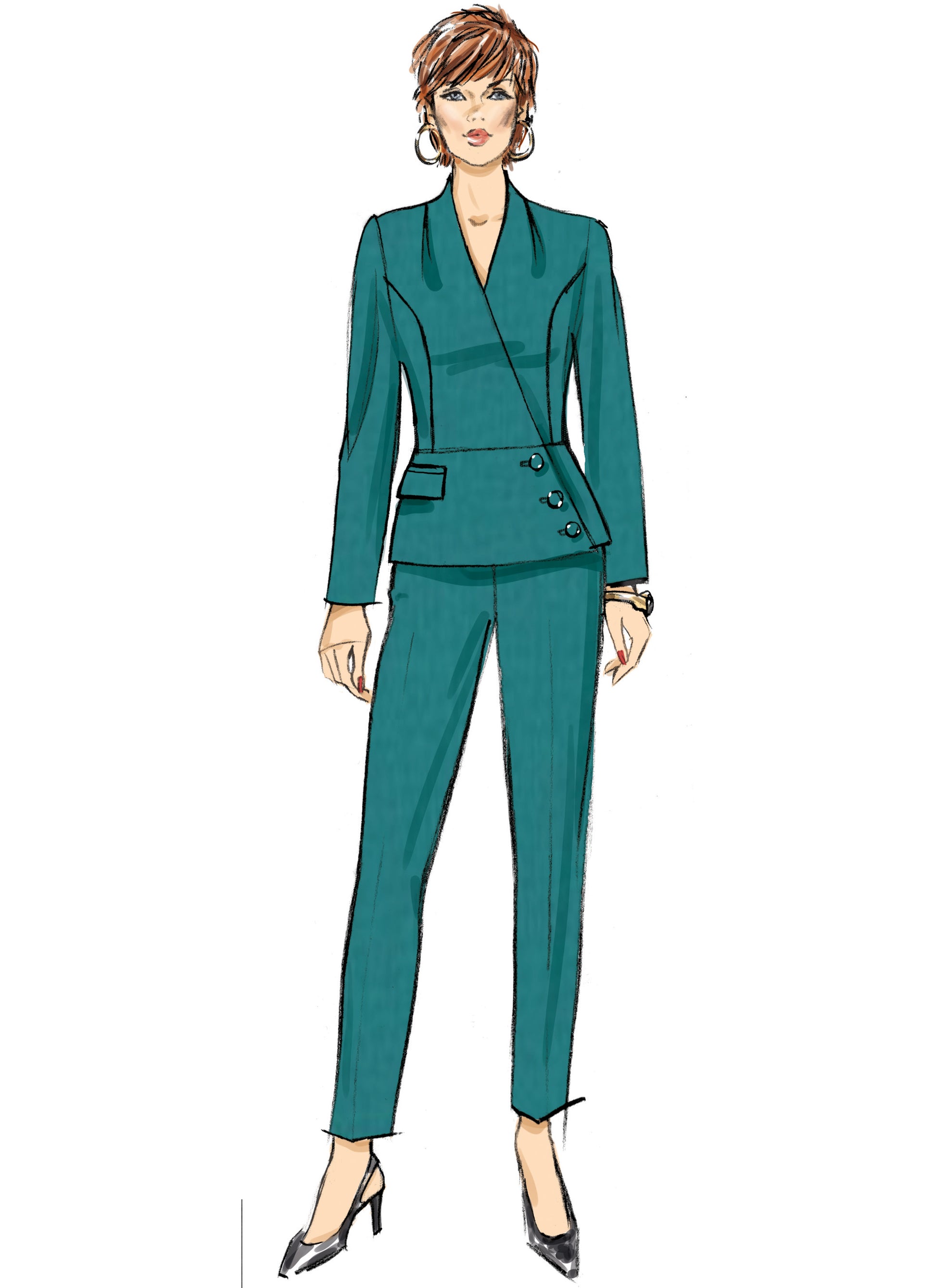 •Classic two-piece suit with a twist! Lined jacket draws asymmetrically across the body and fastens with three buttons. Jacket features flap detail at front. •Pants come in ankle length and includes invisible zipper on the side. •View C are wide leg pants.