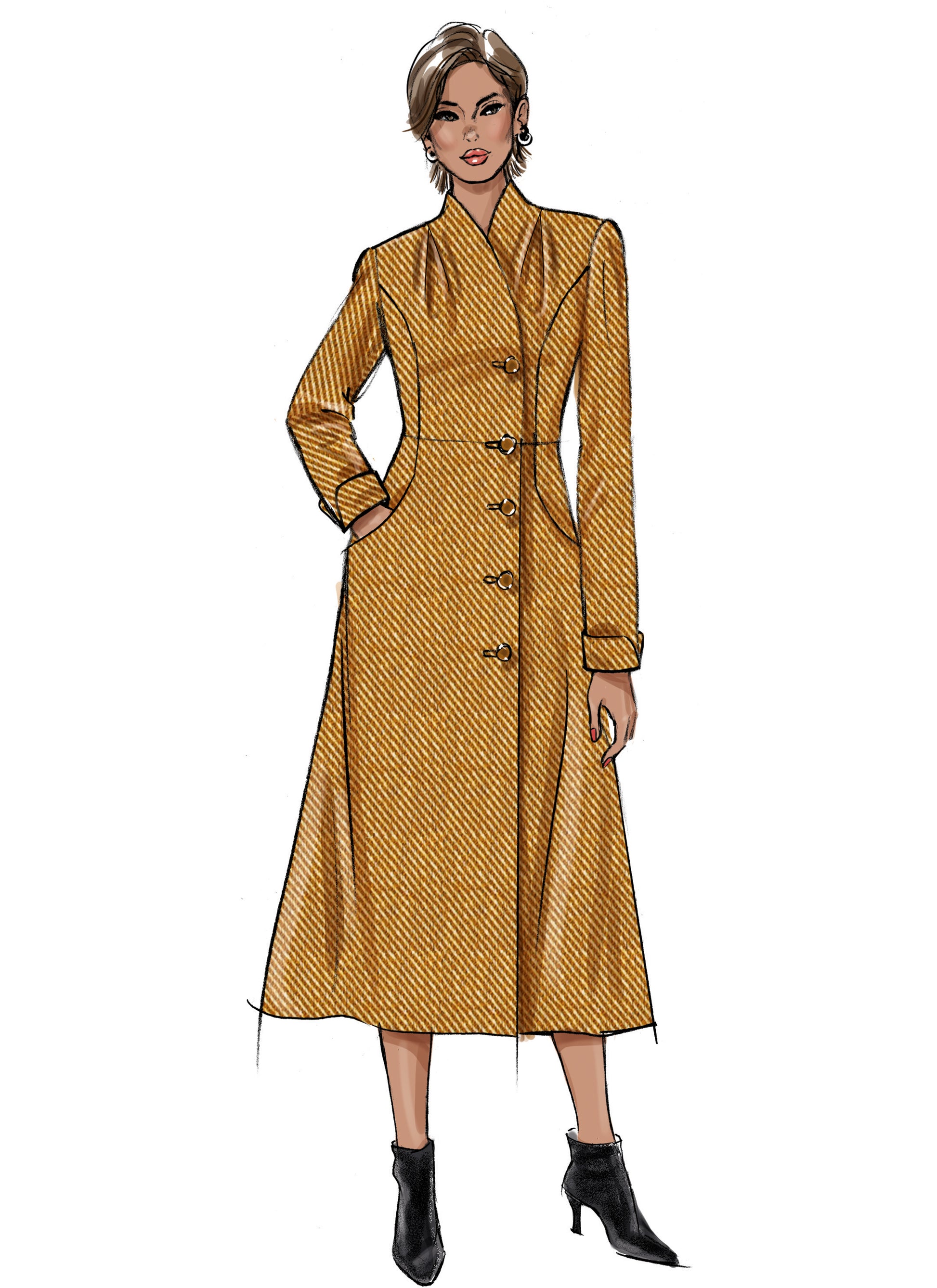 •Button front wrap coat with length variations has stand collar, pleats at shoulders, side pockets, back darts, and center back and waist seams.