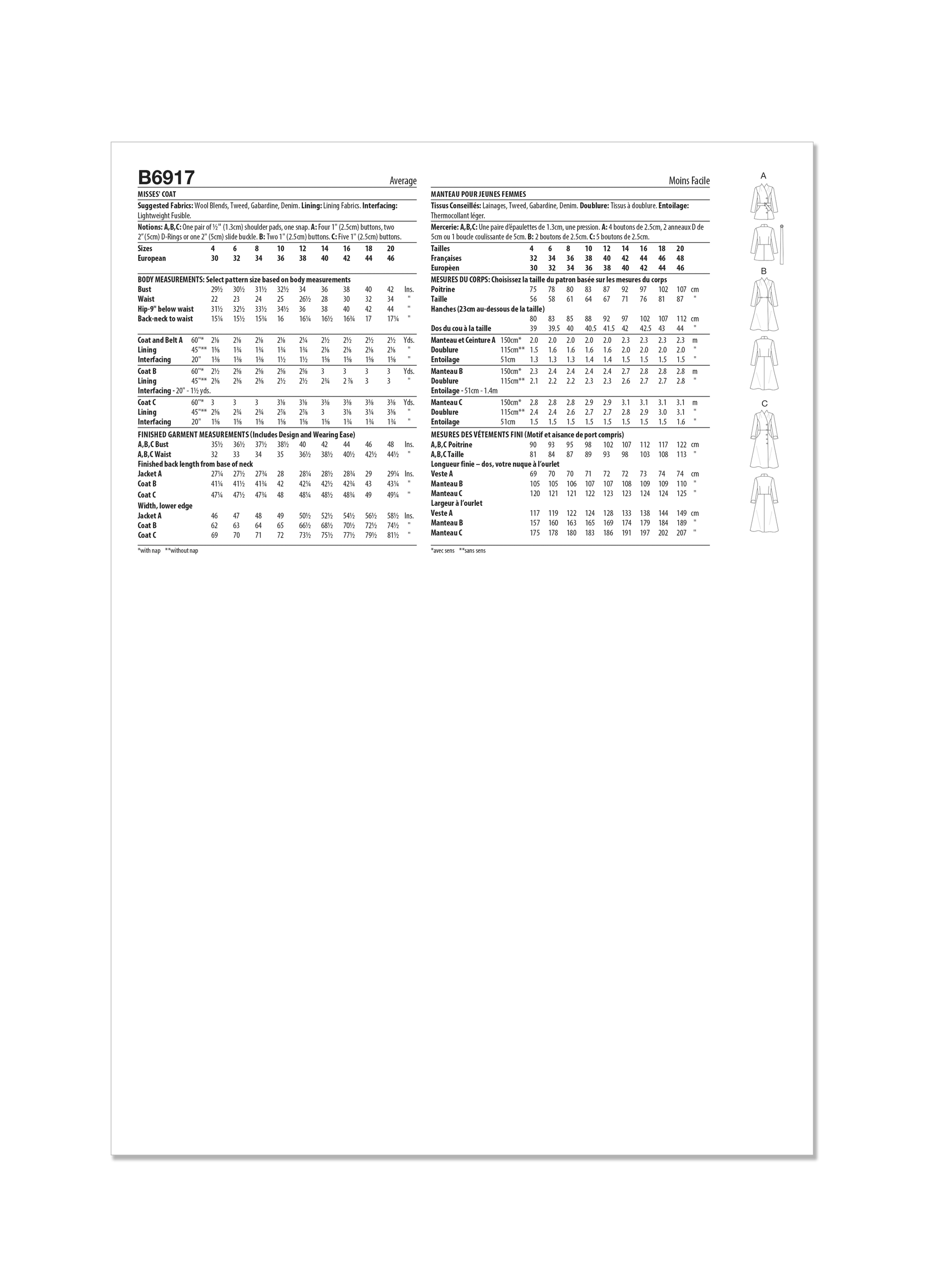 •Coat A has belt with purchased buckle or D-rings, belt loops, and side front buttons. Coat B has two-button closure at waist. Coat C has side front buttons and turnback cuffs.