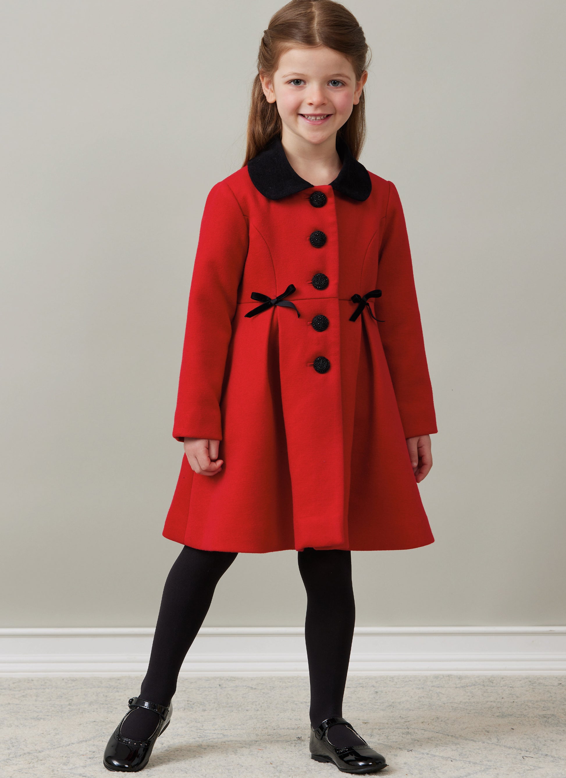•Coat A has contrast collar, buttons and bow details.