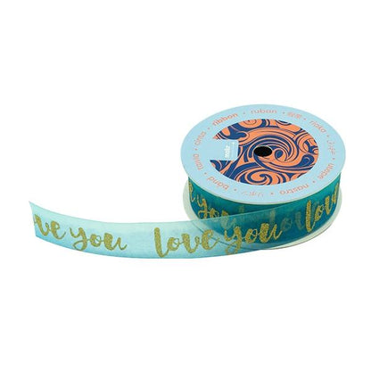Makr Ribbon, Gold Love You Blue Organza- 25mmx3.6m