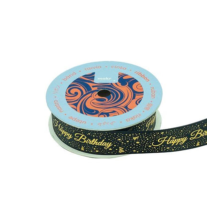 Makr Ribbon, Gold Happy Birthday Black Satin- 22mmx4.5m
