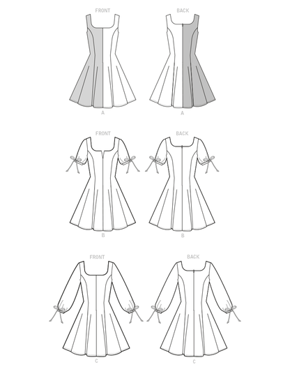 Misses' & women's fit & flare dresses. Round square neckline. B: split V-neckline. Sleeveless, short or 3/4 sleeves. A: color block or print mix.