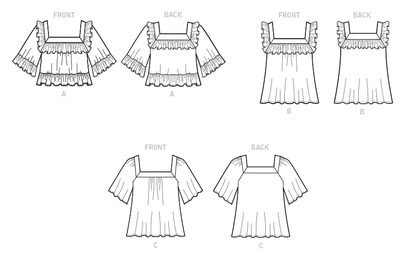Misses' square neck top with & without ruffles, sleeved & sleeveless views, cropped & hip length.