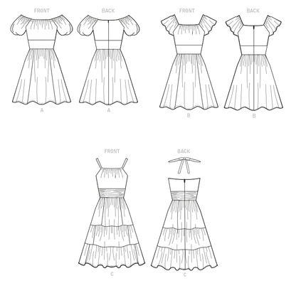 Misses' & women's gathered fit & flare dresses. A, B: elasticized necklines with puff & ruffle sleeve. C: halter dress with tiered skirt.