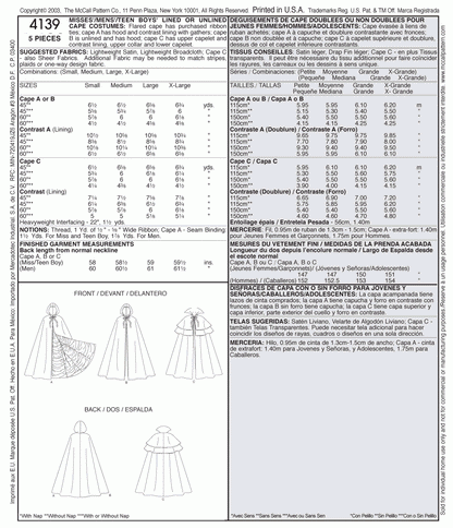 McCall's Pattern M4139 Misses'/Men's/Teen Boys' Lined & Unlined Cape Costumes