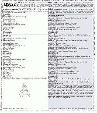 Package includes patterns and instructions for bag in three sizes: small bag, 12" x 8½", medium bag, 14" x 10½", large bag, 16½" x 13½"; all bags have contrast sections, inside pockets and lining; measurements are approximate and exclude handles.
