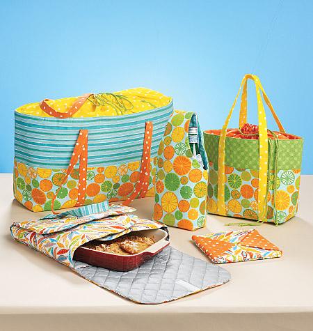 Package includes patterns and instructions for Bottle Carrier A: 5½"W. x 14"L. (14cm x 36cm); contrast lining. Hot Pad B: 7½" (19cm) square; contrast patch sections. Casserole Carrier C: 12" (31cm) square; contrast straps. Small Picnic Tote D: 10"W. x 9½"L. (26cm x 24cm). Large Picnic Tote E: 21"W. x 12½"L. (54cm x 32cm). View D,E have contrast pockets, top, straps and self lining. View E has contrast inside pockets. Measurements for totes are approximate and exclude straps.