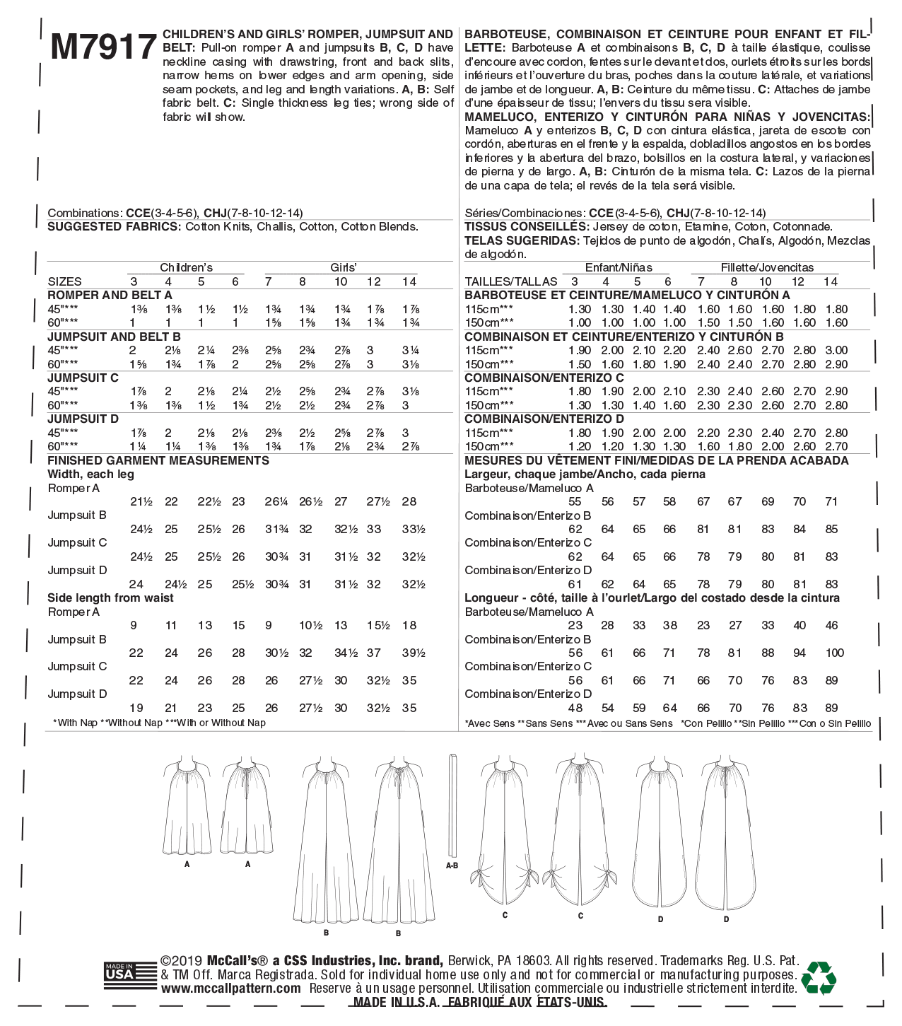McCall's Pattern M7917 Children's and Girl's Romper, Jumpsuit and Belt