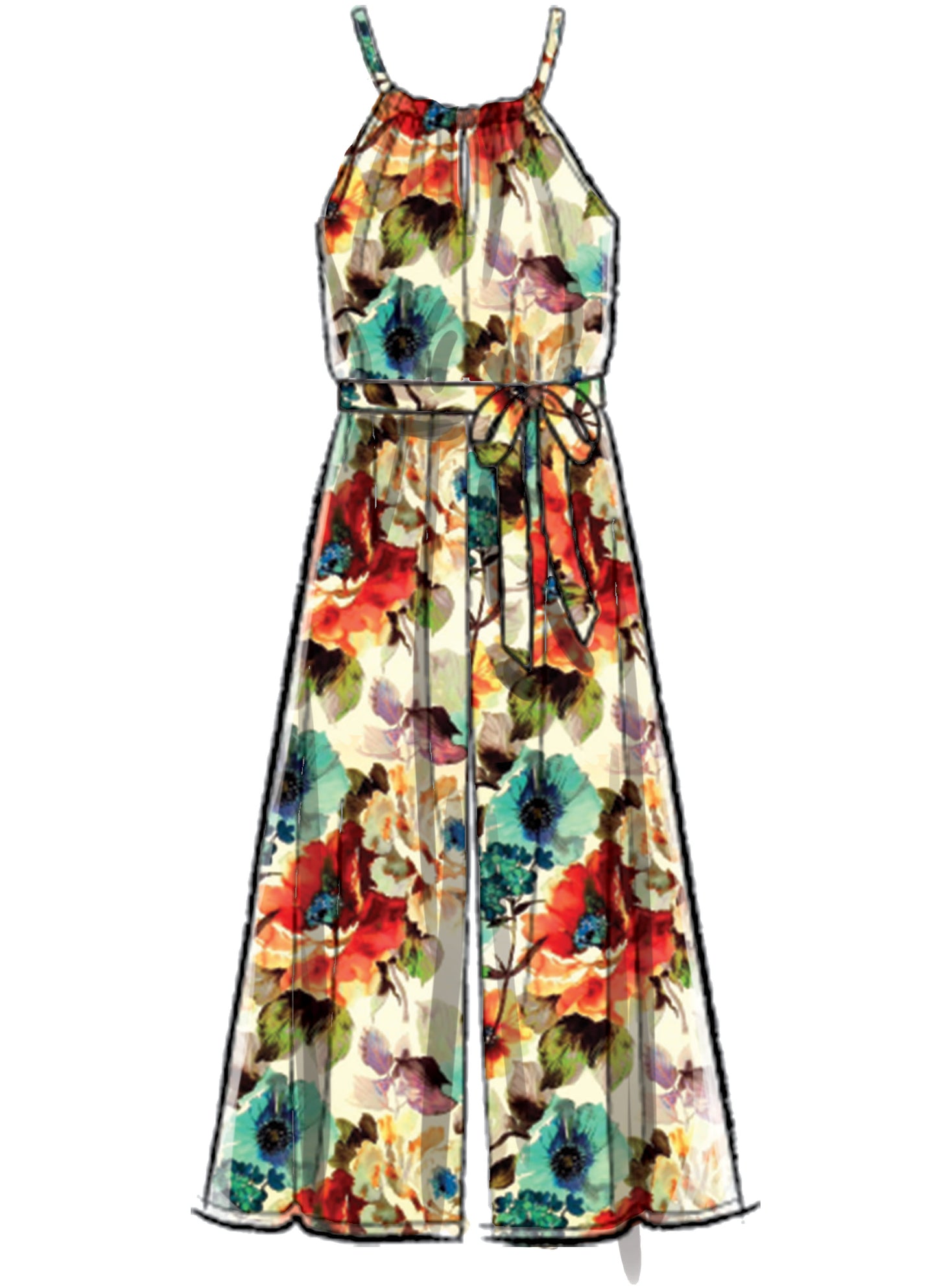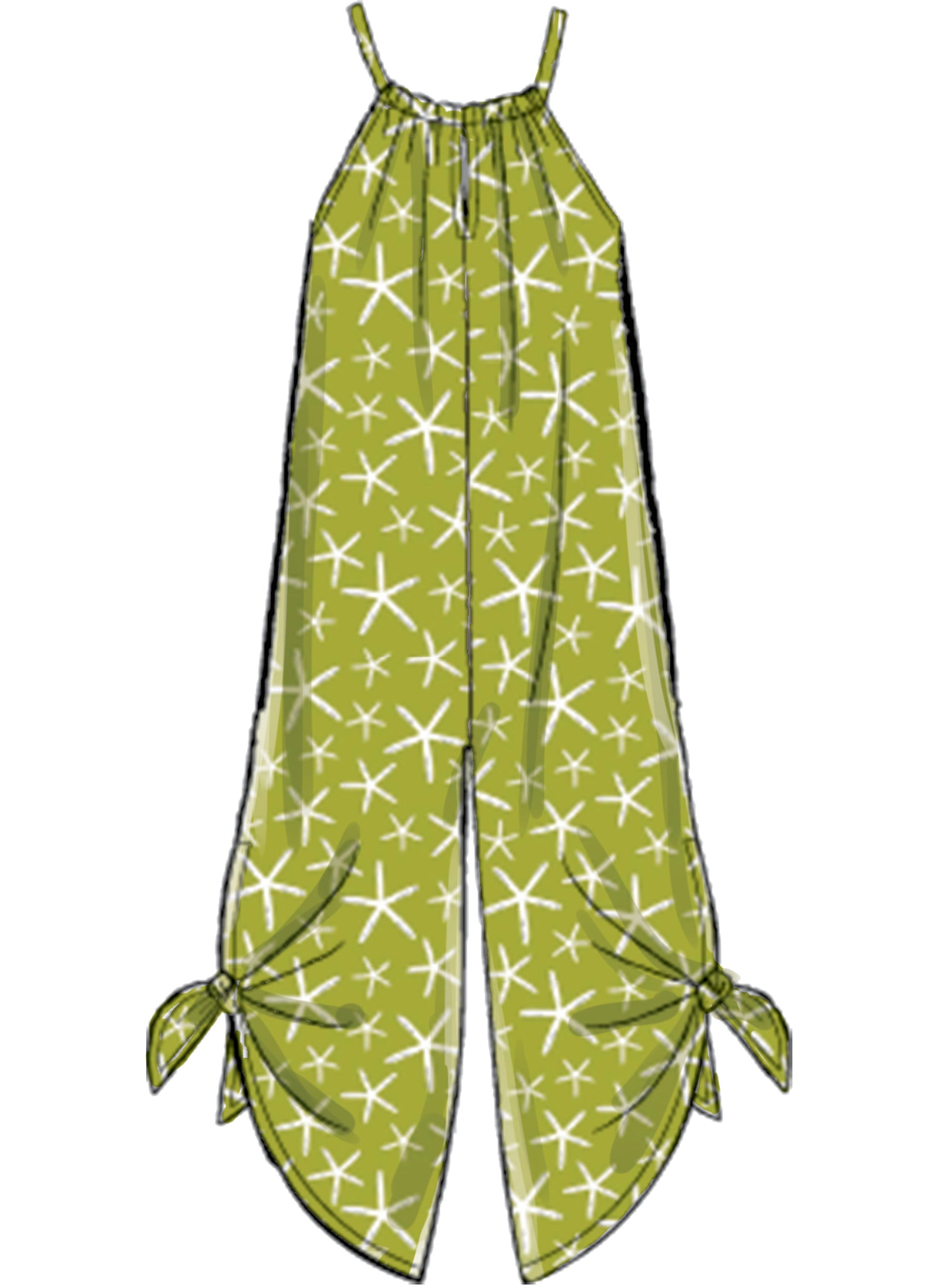 Pull-on jumpsuits have neckline casing with drawstring, front and back slits, narrow hems on lower edges and arm opening, side seam pockets and leg and length variations. A, B: Self fabric belt. C: Single thickness leg ties; wrong side of fabric will show.