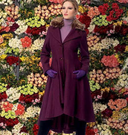 Fitted and flared, lined coats have collar variations, seam detail, side or side front pockets, and two-piece sleeves. B: shaped hemline, lining shows, detachable, lined (elastic loop) collar. C: carriers and belt. D: detachable, lined hood.