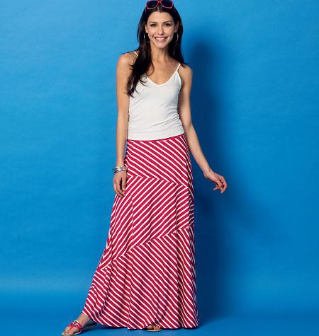 Skirts (below waist) have elasticized waist, self-lined yoke variations and narrow hem. B: shaped hemline, wrong side shows. C: draped yoke. D and E: bias, seam detail. For moderate stretch knits only.