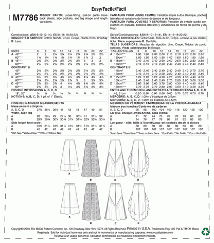 Loose-fitting pull on pants have back elastic, side pockets, and leg shape and length variations.