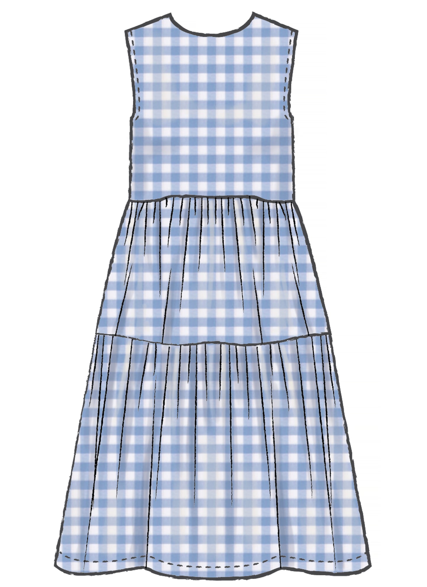 Dresses have back opening with thread loop and eye, and sleeve variations. A, B: Side pockets and pleated skirt. C, D: Gathered skirt with ruffle. D: Flat lace trim.