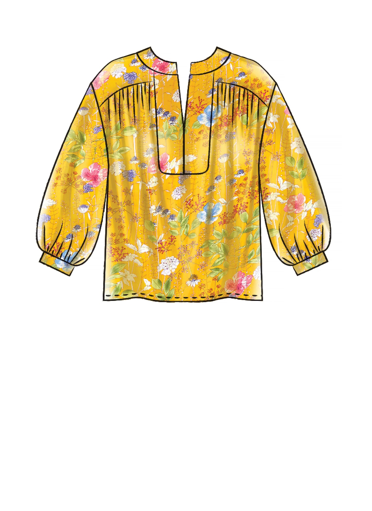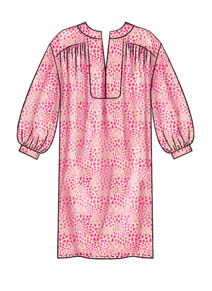 Very loose fitting pullover top, tunic and dresses have front yoke, front and neck bands and hem variations. A, D: sleeve with sleeve band. B, C: sleeveless.