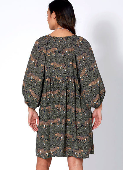 Very loose-fitting, pullover dresses have sleeve variations, neck binding, raised waistline, and narrow hem. B: sleeve and hem ruffles, and purchased trim. C: sleeve and hem ruffles.